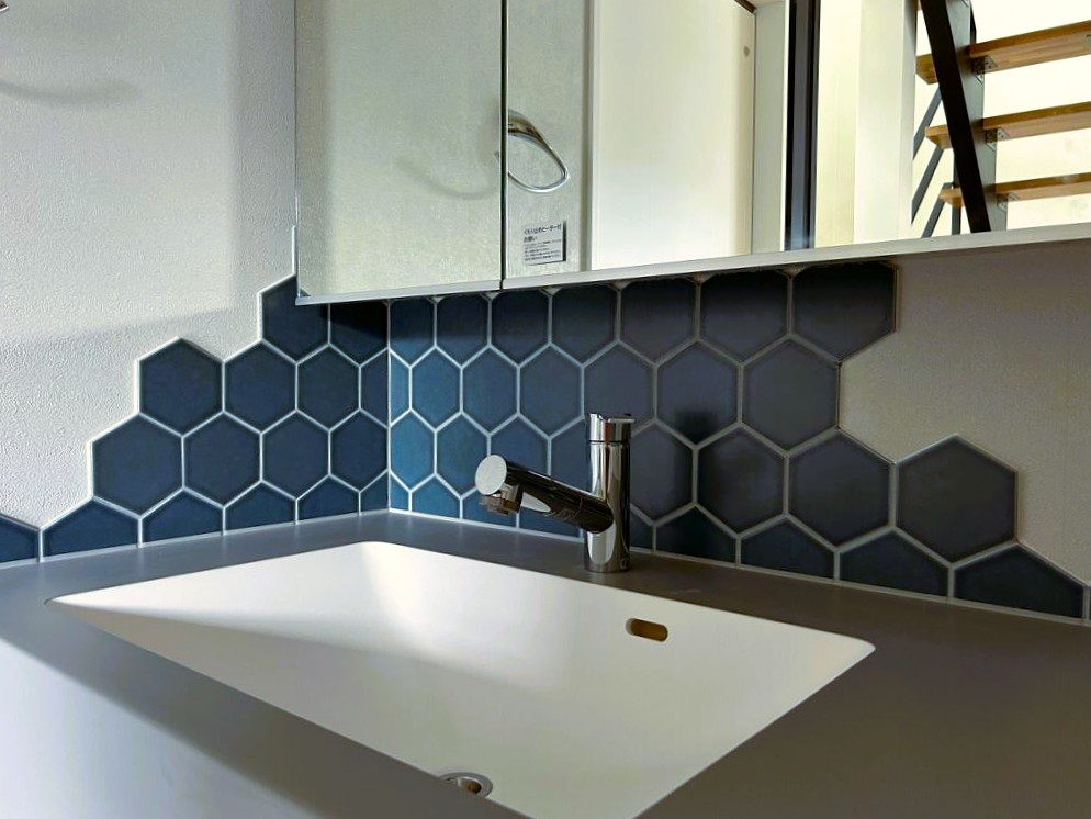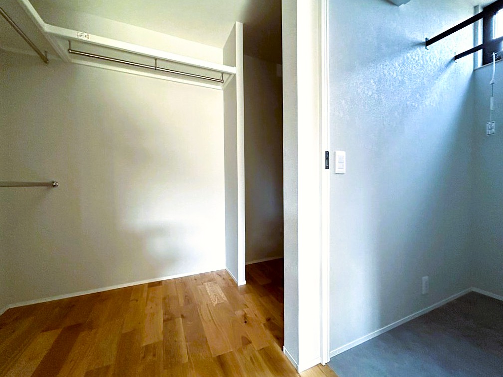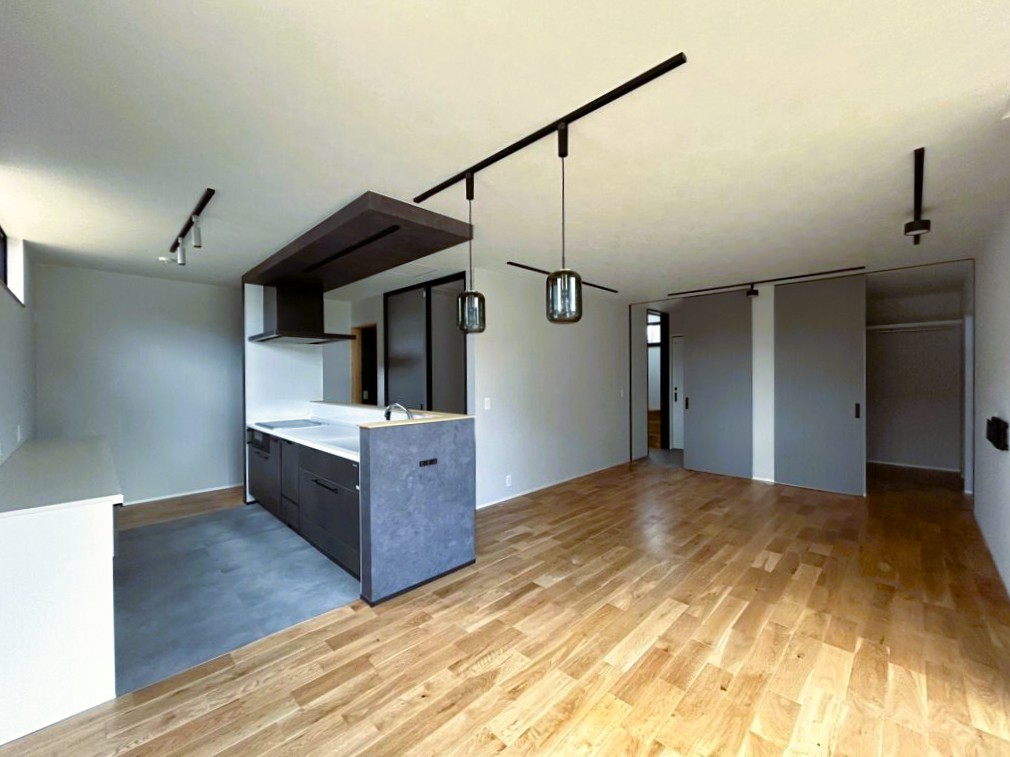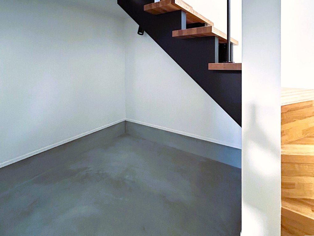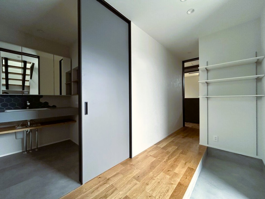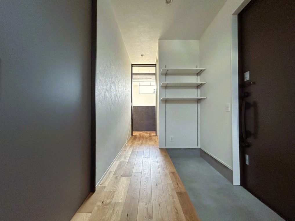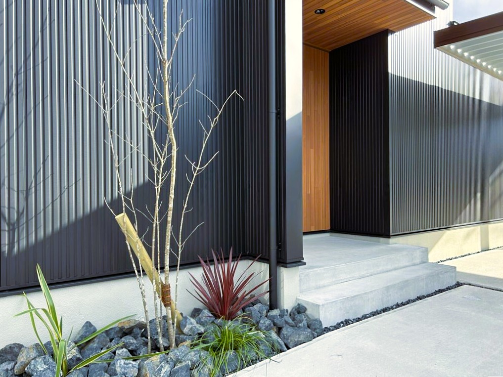 黒のガルバリウム×木のスタイリッシュな外観。玄関は奥行より幅を取り使いやすく、回遊性のある1階への動線もすむー玄関は奥行より幅を取り使いやすく、回遊性のある1階への動線もすむー