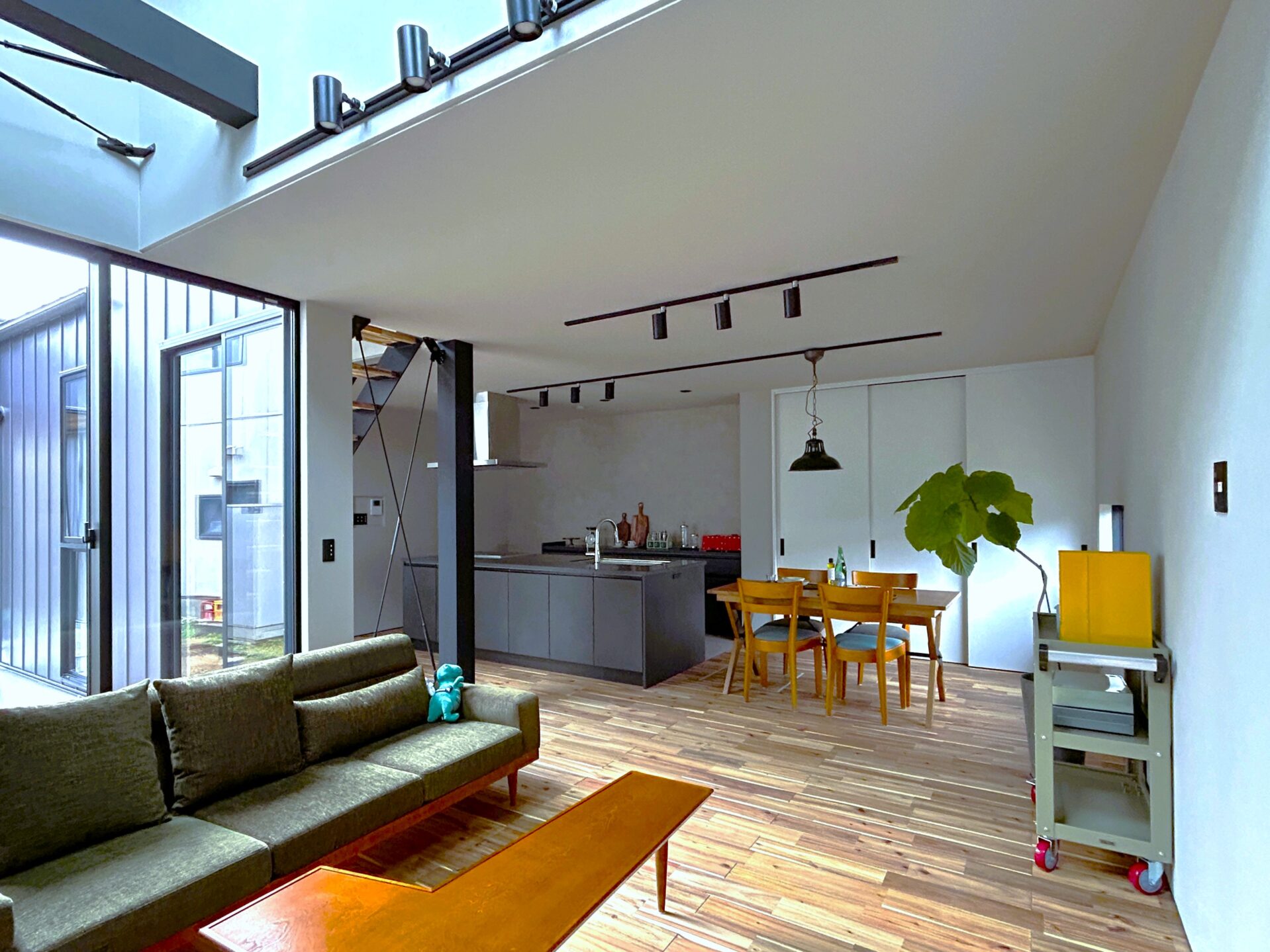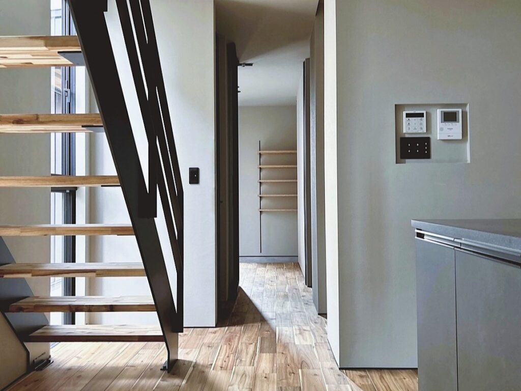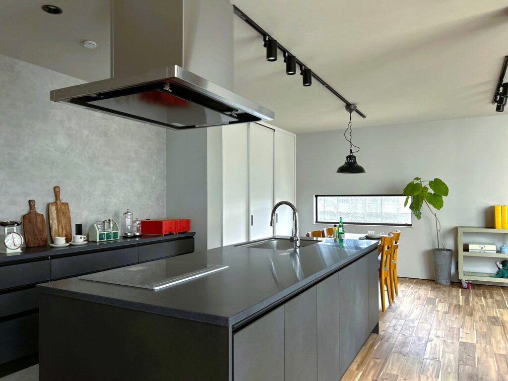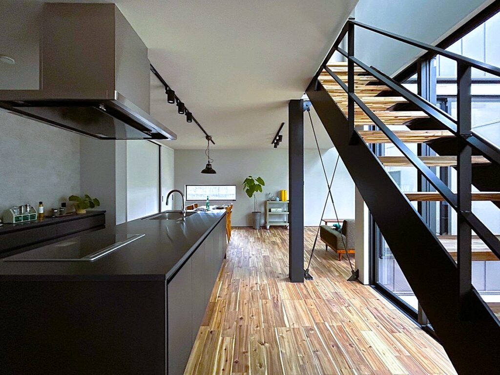 シンプルでかっこいいデザインが好みのご夫婦。床材のアカシアは重厚感を感じ、黒のアイアンや照明がより空間を引き締めます。キッチンの回遊動線やたっぷりの収納も毎日忙しい奥様の強い味方になりそう!