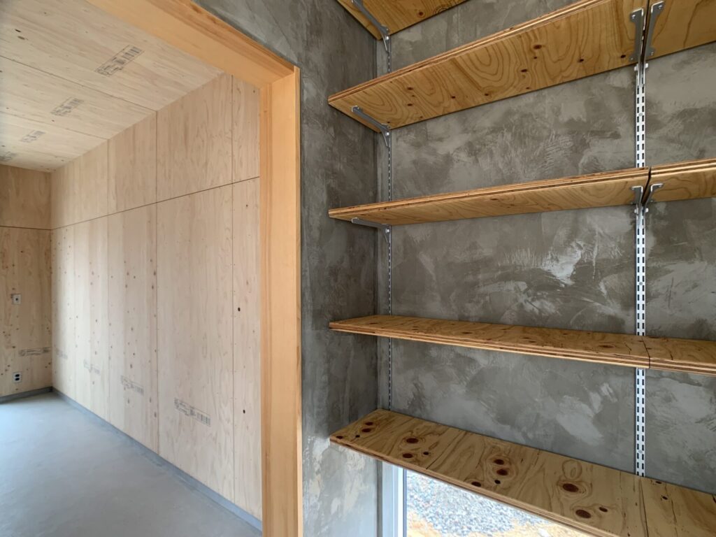 合板のラフな仕上げで、工具や棚を自由にレイアウトしながらDIYを楽しめる空間です。
