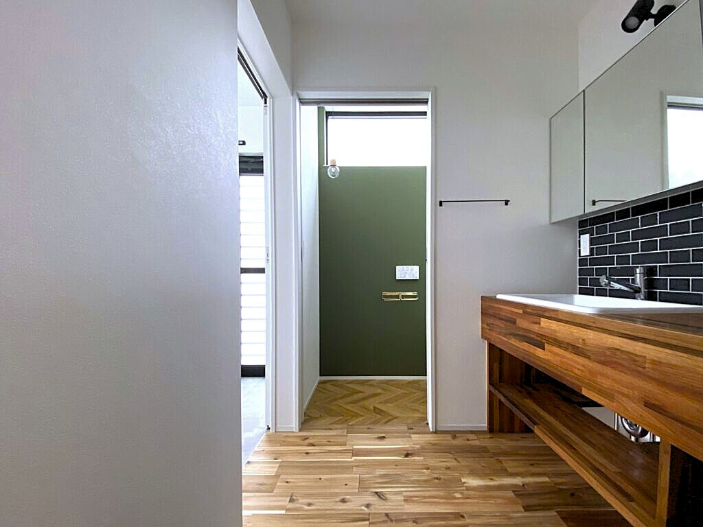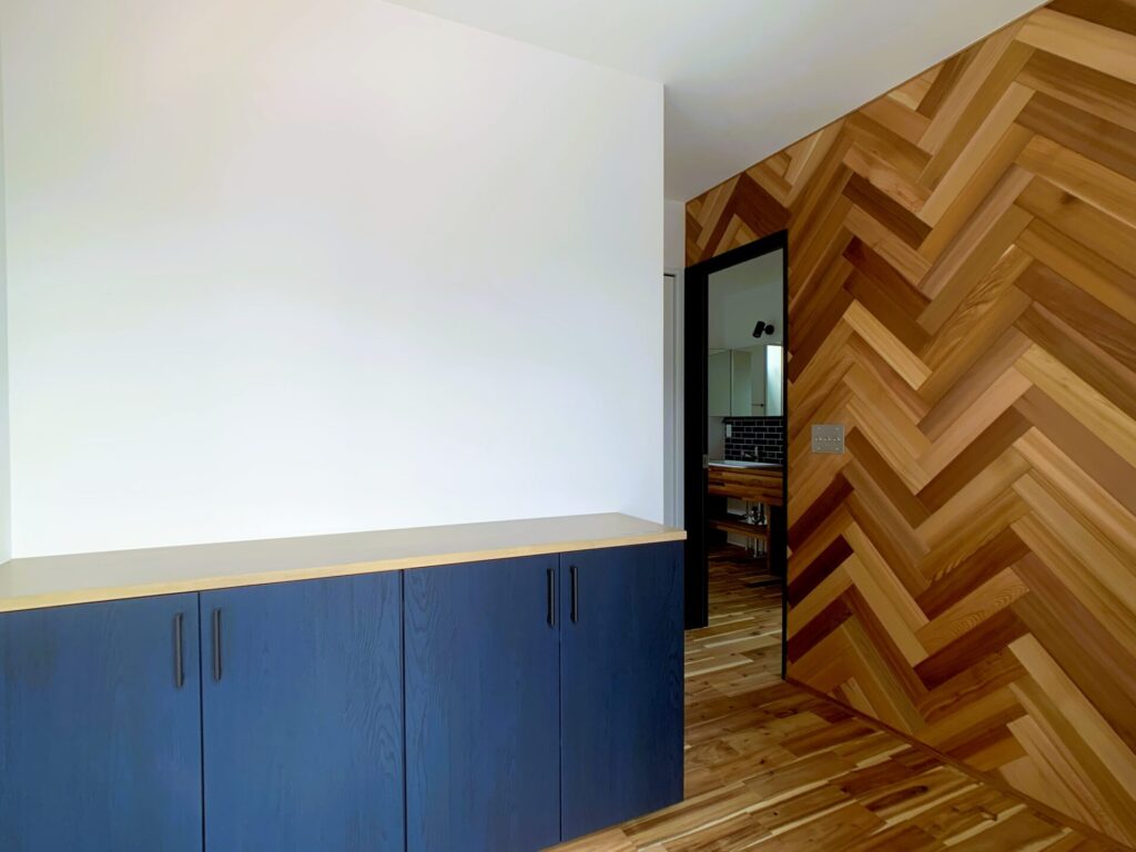 インパクトのある玄関の壁はヘリンボーン張り。家に帰るのが楽しくなる玄関まわりです。