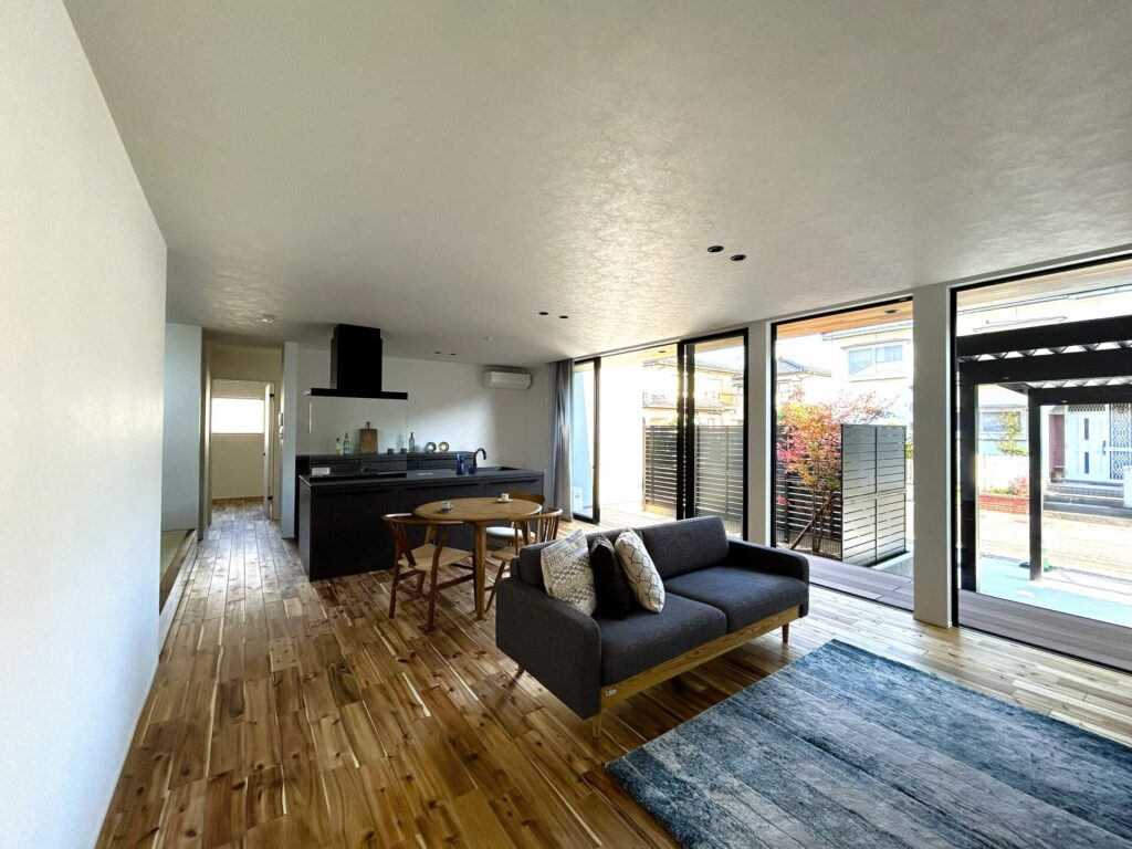 リビングの一角には小上がりの畳スペースを設置。床下収納を備え、壁で囲むことで客間や個室としても使える柔軟な空間です。