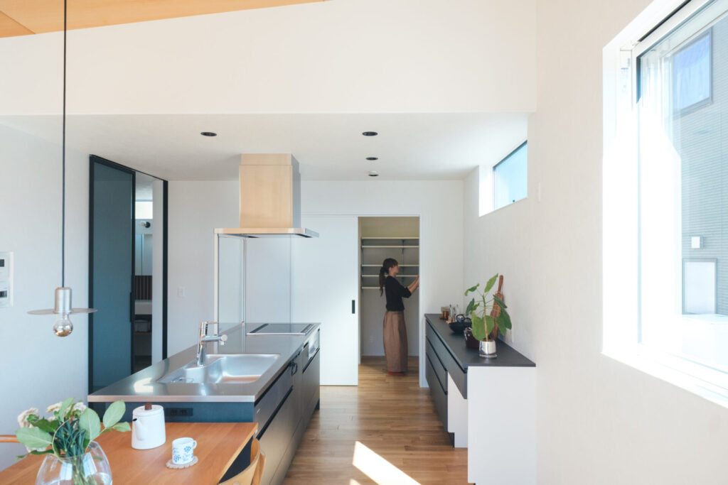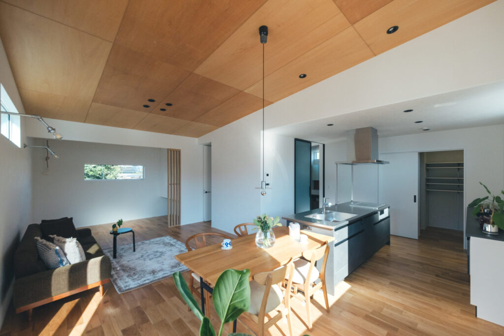 勾配天井一面に木を張った、光と木に包まれるやさしいリビング空間。窓から降り注ぐ陽だまりがほっこりする心地いいお住まいです。キッチンと収納をつなぐ移動経路を回遊にすることで家事効率が激変!!