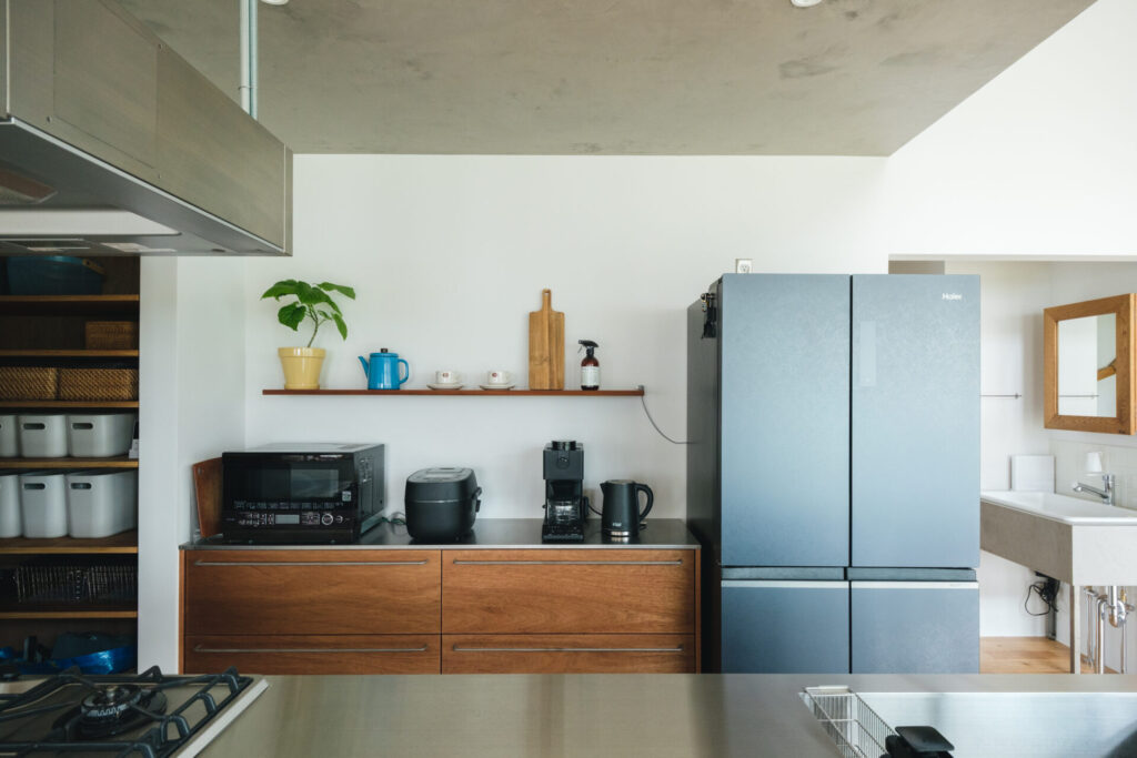 隣接するパントリーには木の素材を取り入れ、機能性と温かみのある収納空間に仕上げています。
