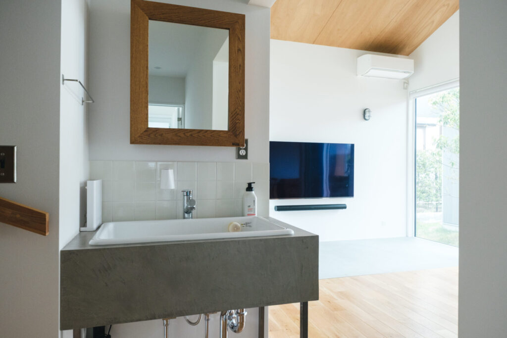 家族が帰宅後すぐに手を洗えるよう、玄関やキッチンに近い動線上に手洗いスペースを設置。